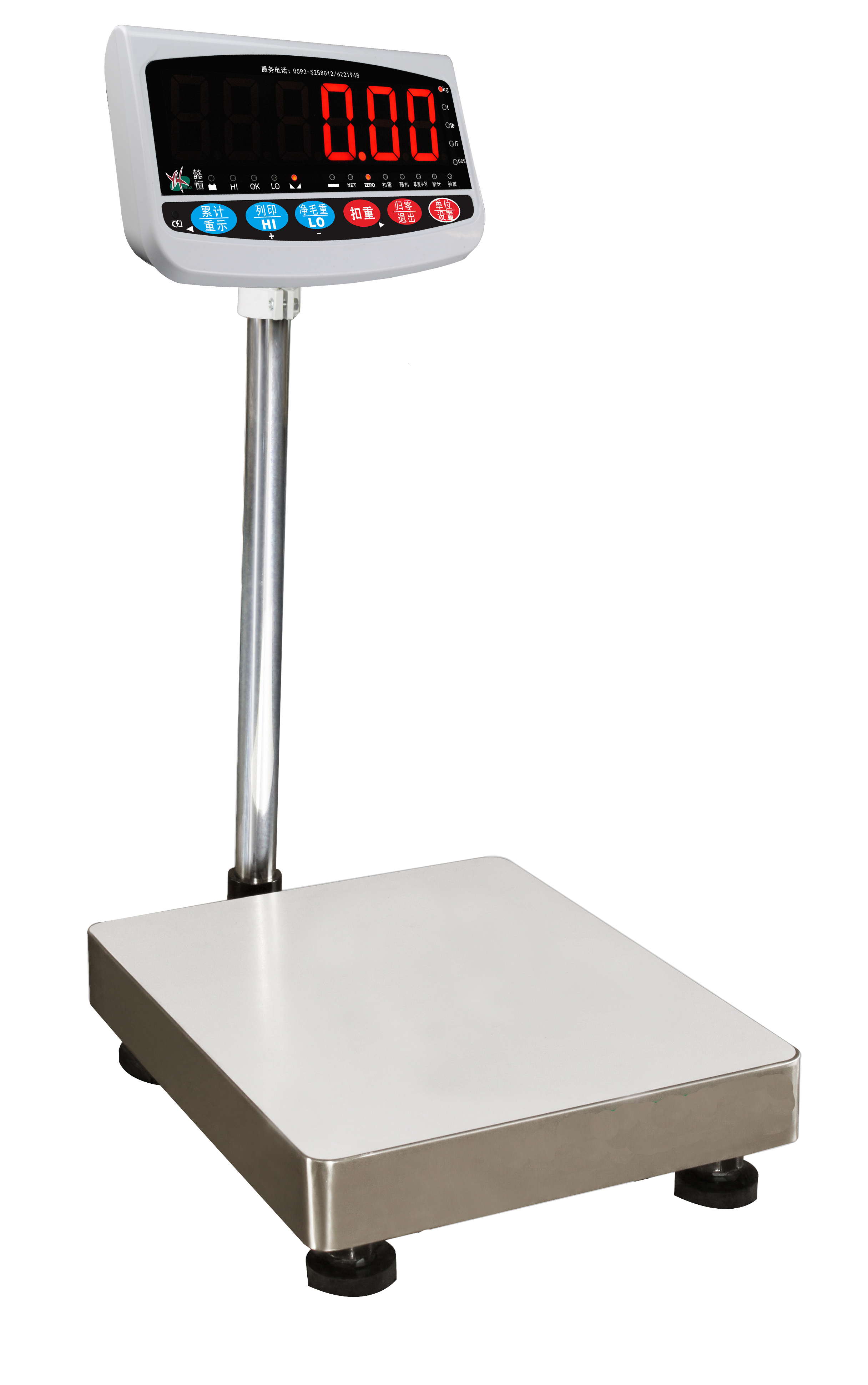 1、超大LED顯示,1/15000高精度設計,適用范圍廣泛。 2、圓倒角燒焊結構,美觀耐用。 3、適用1-4個荷重元裝置電子成秤。 4、具有單點校正或三點校正功能,確保精準度。 5、具有多重稱重單位及簡易計數,百分比計算功能,用途廣泛。 6、具有重量警示功能,可設定上限,標準,下限三段重量警示,并具有一組記憶功能。 7、具有累計重量之功能,操作簡單方便。 8、具有自動調整零點及軟體濾波功能,稱重反應速度可依使用環境不同調整。 9、可采用充電,插電兩用方式供選擇,免除電源不穩定及停電困擾。 10、可選配雙向RS-232接口,外接計算機,自粘式或撞針小型打印機及三色警示燈。 產品規格表: